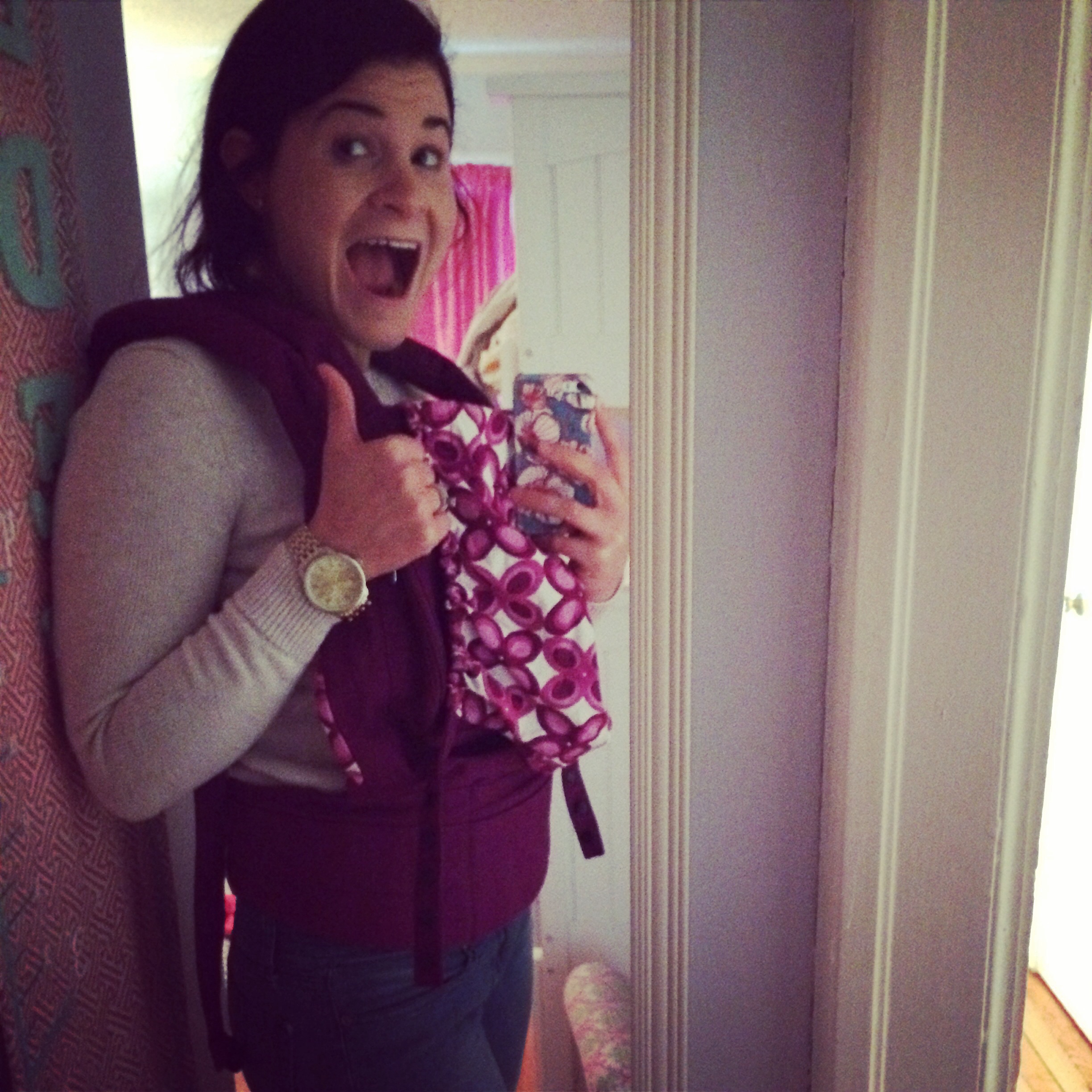 I turned around to check on Eden, she was playing with a toy kitchen set and I noticed something sitting on top. What was it? A beautifully packaged, never-been-opened baby carrier I had been looking for, 75% off! It’s even in a pretty color. I mean, does God get any more personal than that?!? I was a tad excited, so I took a picture of me wearing it that afternoon to send to Hayes at work. I was tempted to put one of Eden’s dolls in it and walk around awhile, but refrained. These things are NOT coincidences my friends, and we should get ZERO credit for anything that we are doing. It is ALL God. We are just happy to be in His will along for the ride!